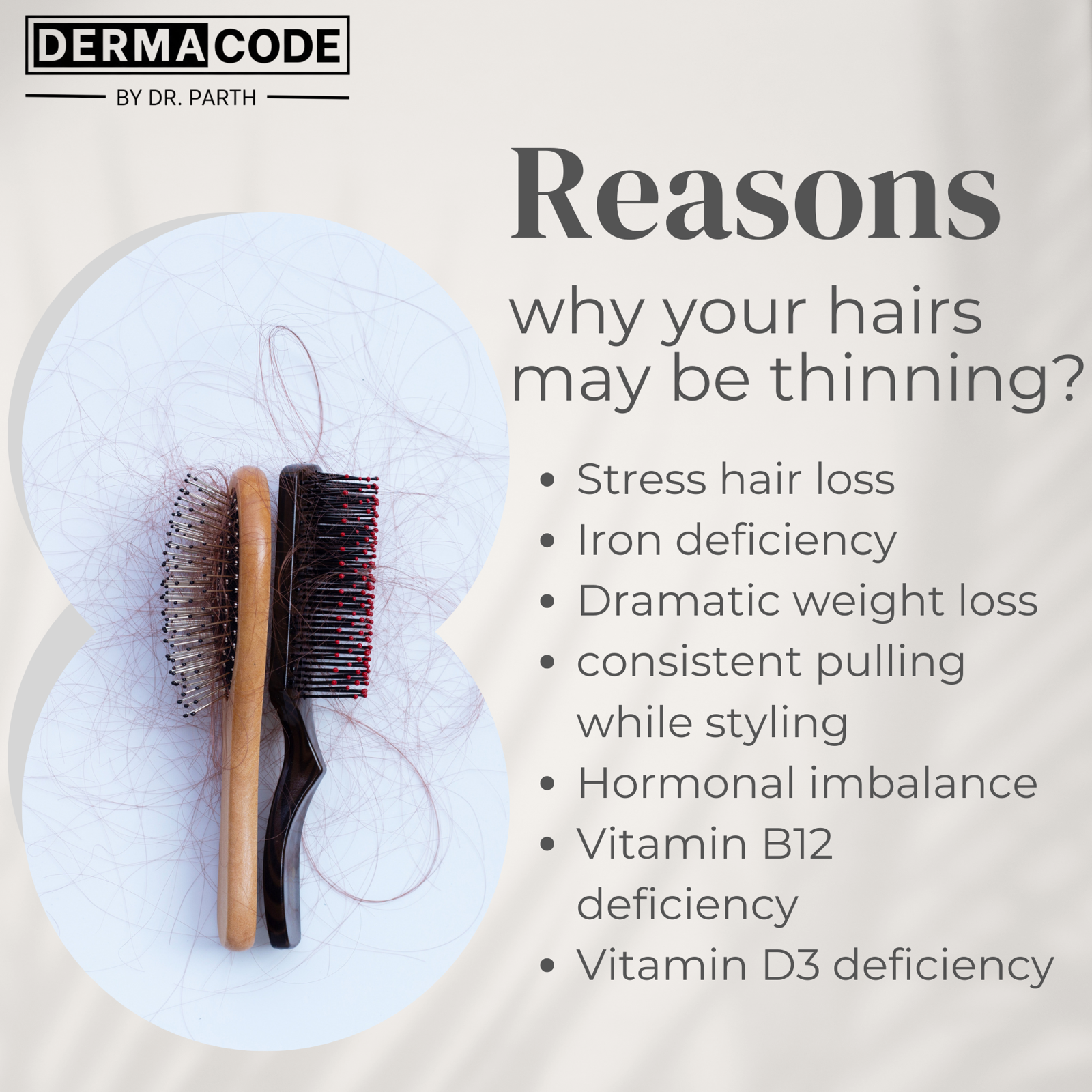 πΏ Reasons for Hair Thinning | by Dr. Parth Thakkar Are you noticing reduced hair volume or visible scalp areas? Hair thinning is a common concern among both men and women β and understanding the root cause is the first step toward the right treatment. π Common Reasons for Hair Thinning: 1. Genetic factors (Androgenetic Alopecia) β Hereditary hair loss that gradually causes thinning over time. 2. Stress and lifestyle β Chronic stress, poor sleep, and unhealthy diet affect hair growth cycles. 3. Hormonal imbalance β Thyroid issues, PCOS, or post-pregnancy changes can trigger thinning. 4. Nutritional deficiency β Lack of proteins, iron, vitamin D, and biotin weakens hair roots. 5. Chemical treatments and styling β Overuse of heat styling, color, or chemical treatments can damage follicles. 6. Medical conditions & medications β Autoimmune disorders or certain drugs can cause temporary or permanent hair loss. πββοΈ Advanced Hair Thinning Treatments : by Dr. Parth Thakkar, we offer scientifically proven solutions for hair thinning including: β’ PRP Therapy & GFC Treatment for hair regrowth β’ Meso Therapy for scalp nourishment β’ QR678 & Hair Transplant for advanced hair restoration β’ Customized diet & medical advice for long-term results Restore your confidence with personalized hair loss treatments in Surat by Dr. Parth Thakkar (MD Dermatologist) β trusted for hair fall and scalp treatment with 6+ years of expertise.